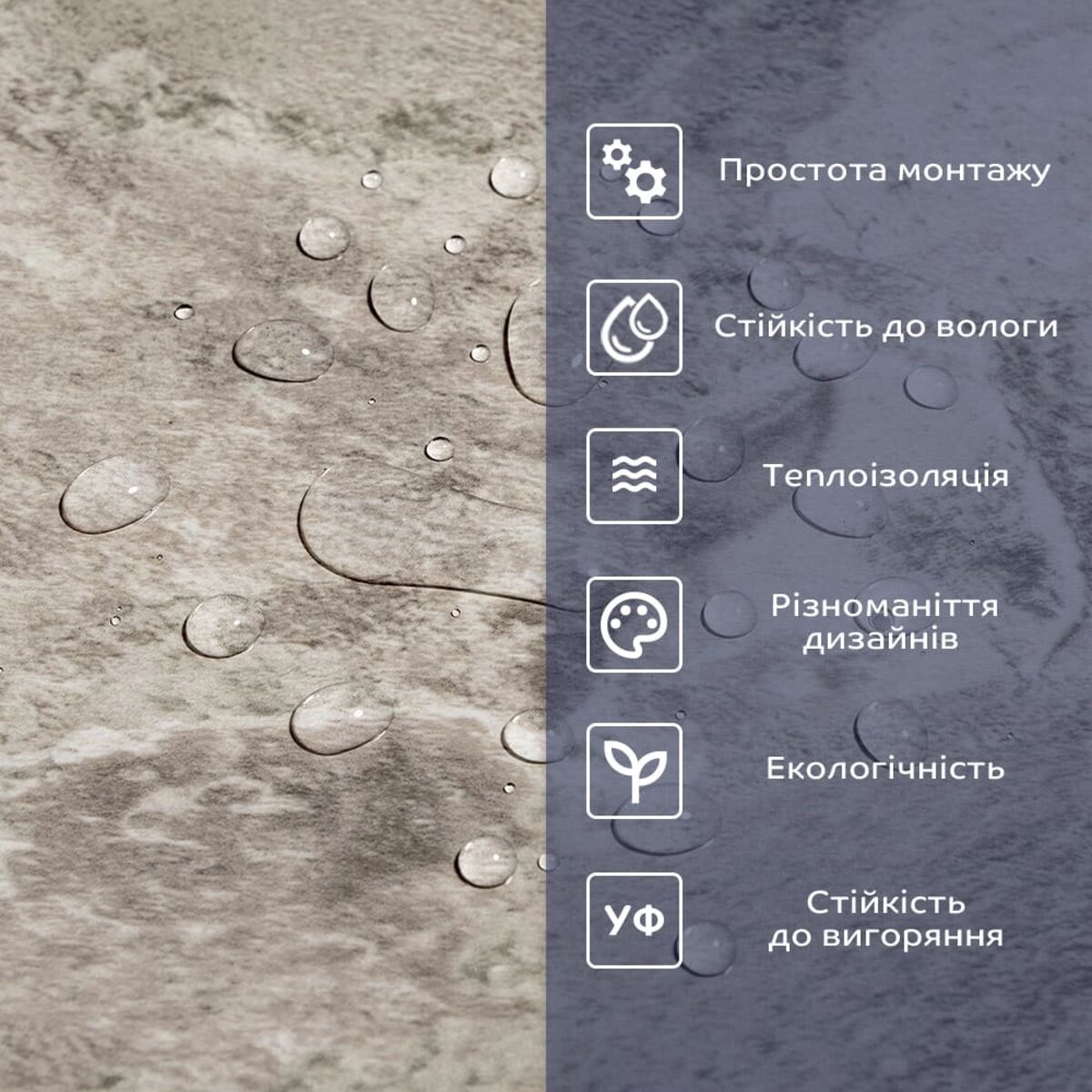 - Декоративний шар: плівка з кольоровим друком високої якості, яка повністю імітує фактуру природних матеріалів завдяки чіткому та деталізованому зображенню.