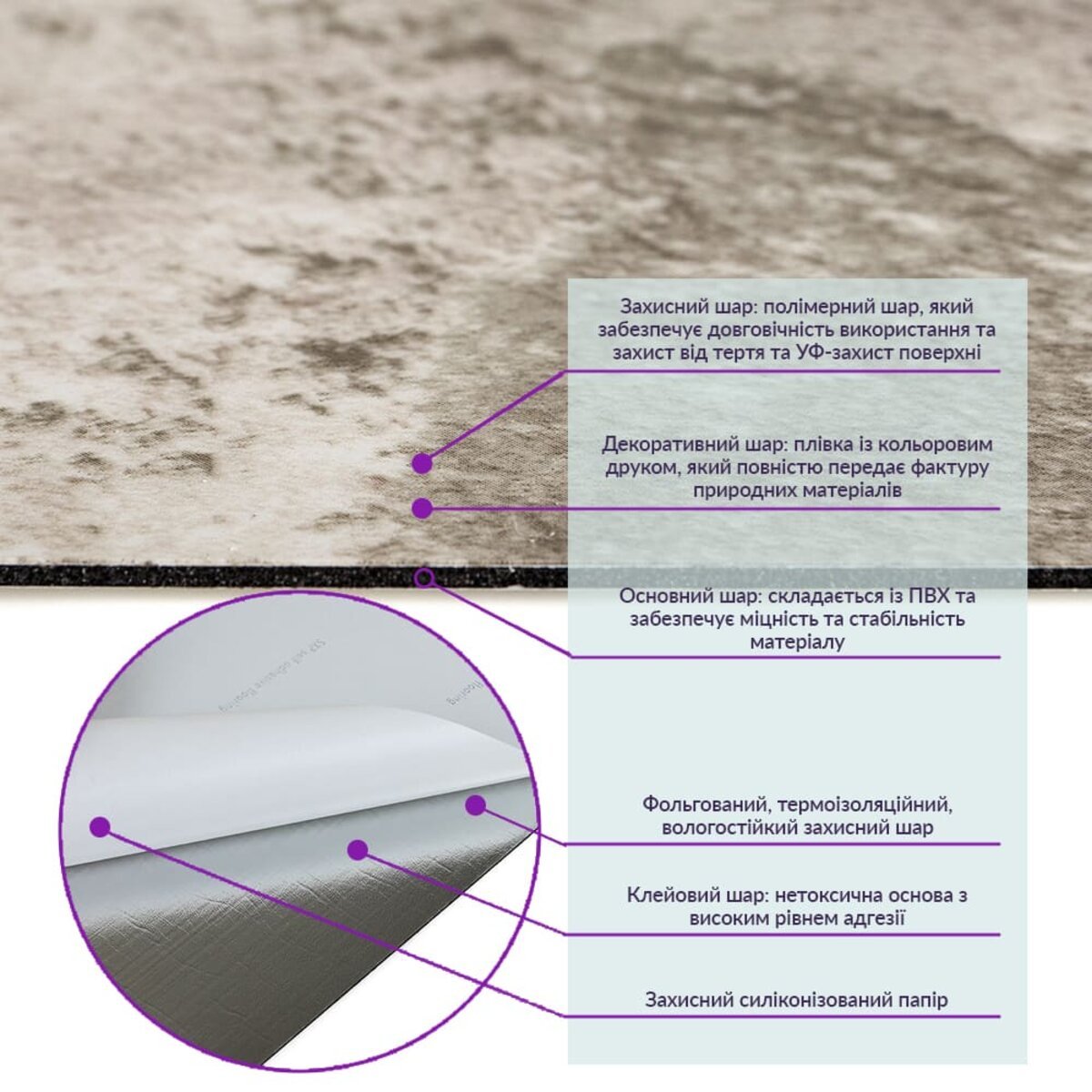 - Полімерний шар: захищає від потертостей та дрібних механічних пошкоджень, забезпечує довговічність використання, а УФ захист допомагає запобігти вигоранню, зберігаючи колір насиченим.