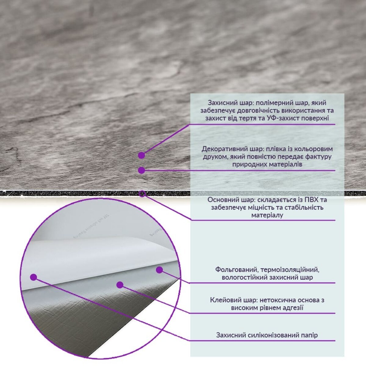 - Декоративний шар: плівка з кольоровим друком високої якості, яка повністю імітує фактуру природних матеріалів завдяки чіткому та деталізованому зображенню.