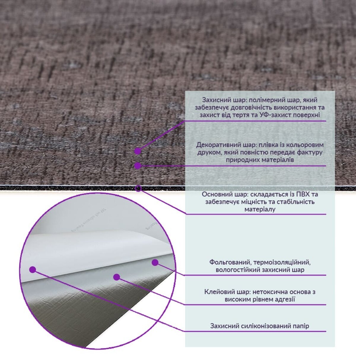 - Полімерний шар: захищає від потертостей та дрібних механічних пошкоджень, забезпечує довговічність використання, а УФ захист допомагає запобігти вигоранню, зберігаючи колір насиченим.