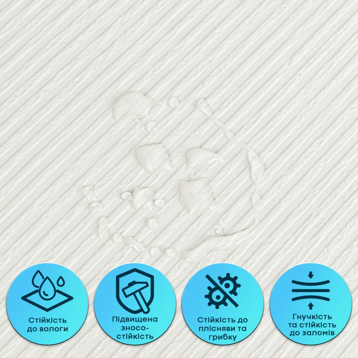 Гнучка штукатурка не вбирає воду, не набухає та не деформується під впливом вологи. Матеріал стійкий до пари, не сприяє утворенню плісняви та підходить для приміщень із підвищеною вологістю — кухонь, ванних кімнат. Може застосовуватися в зоні кухонного фартуха (за умови відступу від плити на 25-30 см).