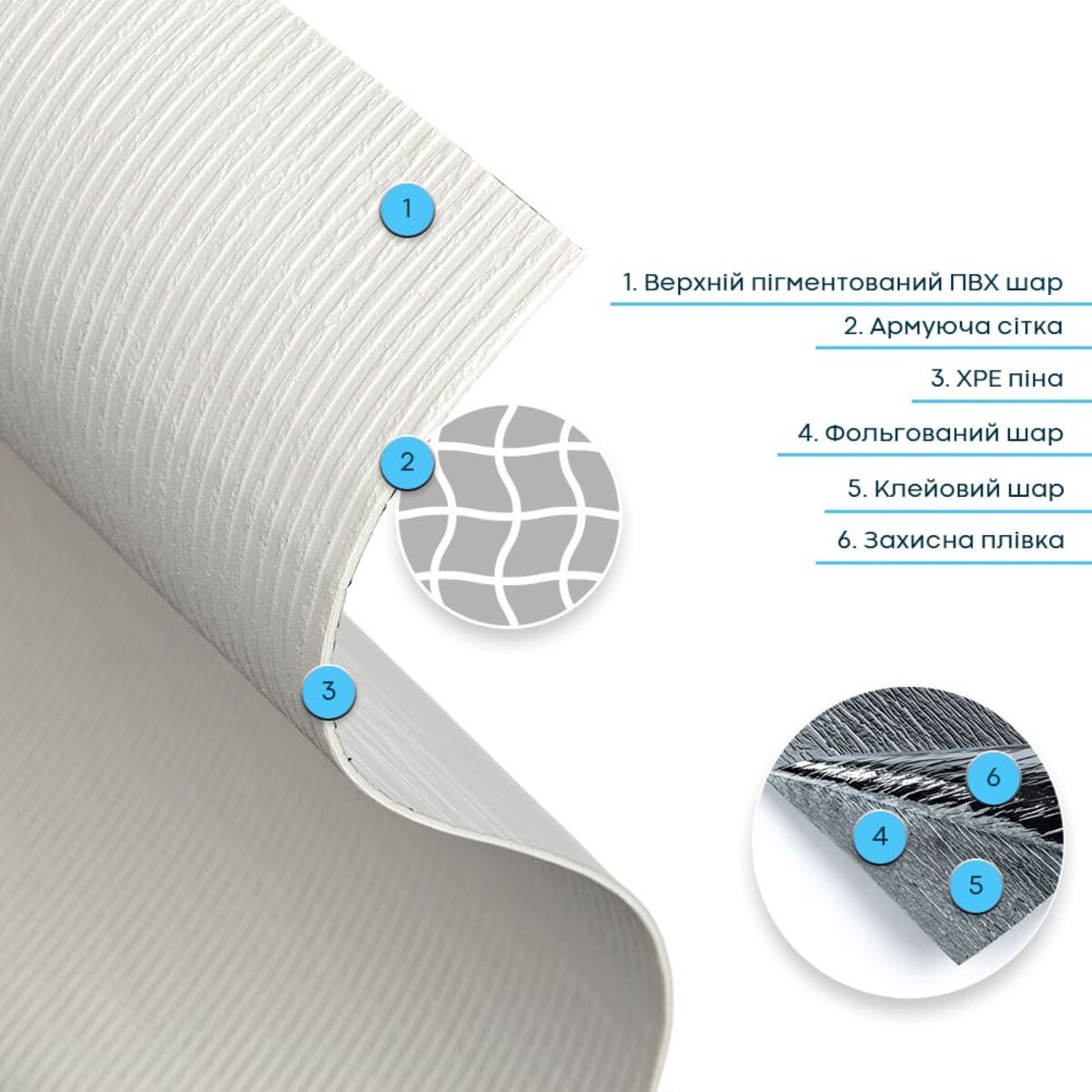 • Армувальна сітка — це внутрішній зміцнювальний шар, який підвищує стабільність і міцність верхнього шару ПВХ. Виготовлена зі синтетичного матеріалу, вона не розтягується, допомагає зберігати форму та фактуру під час монтажу й експлуатації, а також запобігає деформаціям матеріалу.