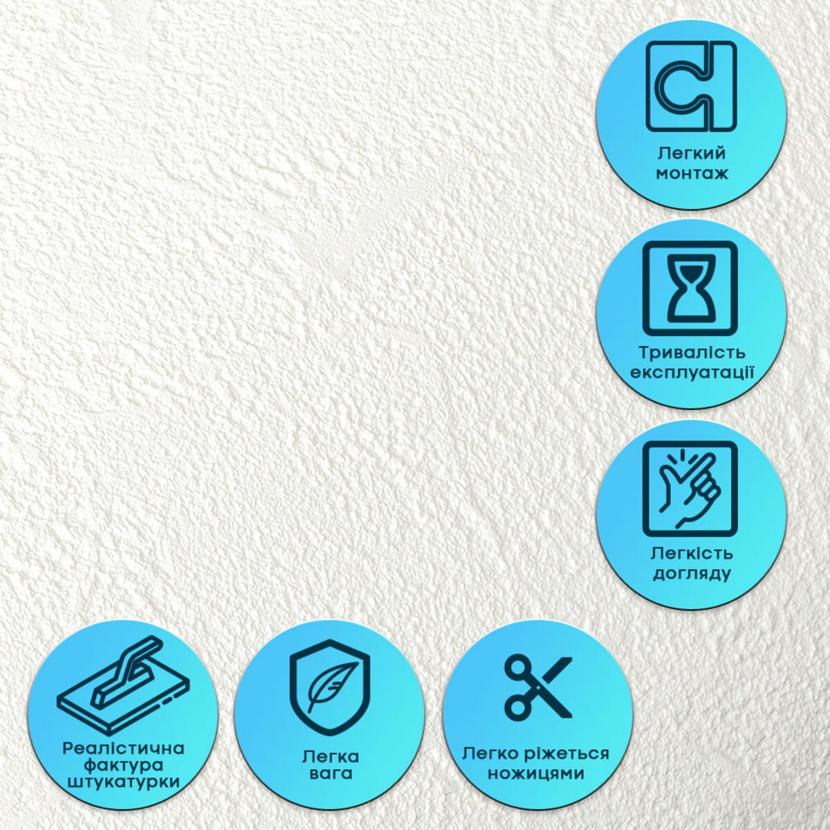 Матеріал є еластичним і легко згинається, що дозволяє монтувати його на нерівні та складні поверхні. Завдяки вбудованій армувальній сітці штукатурка не розтягується, не створює заломів і не деформується під час монтажу або експлуатації. Це гарантує стабільну геометрію та акуратний вигляд після наклеювання.