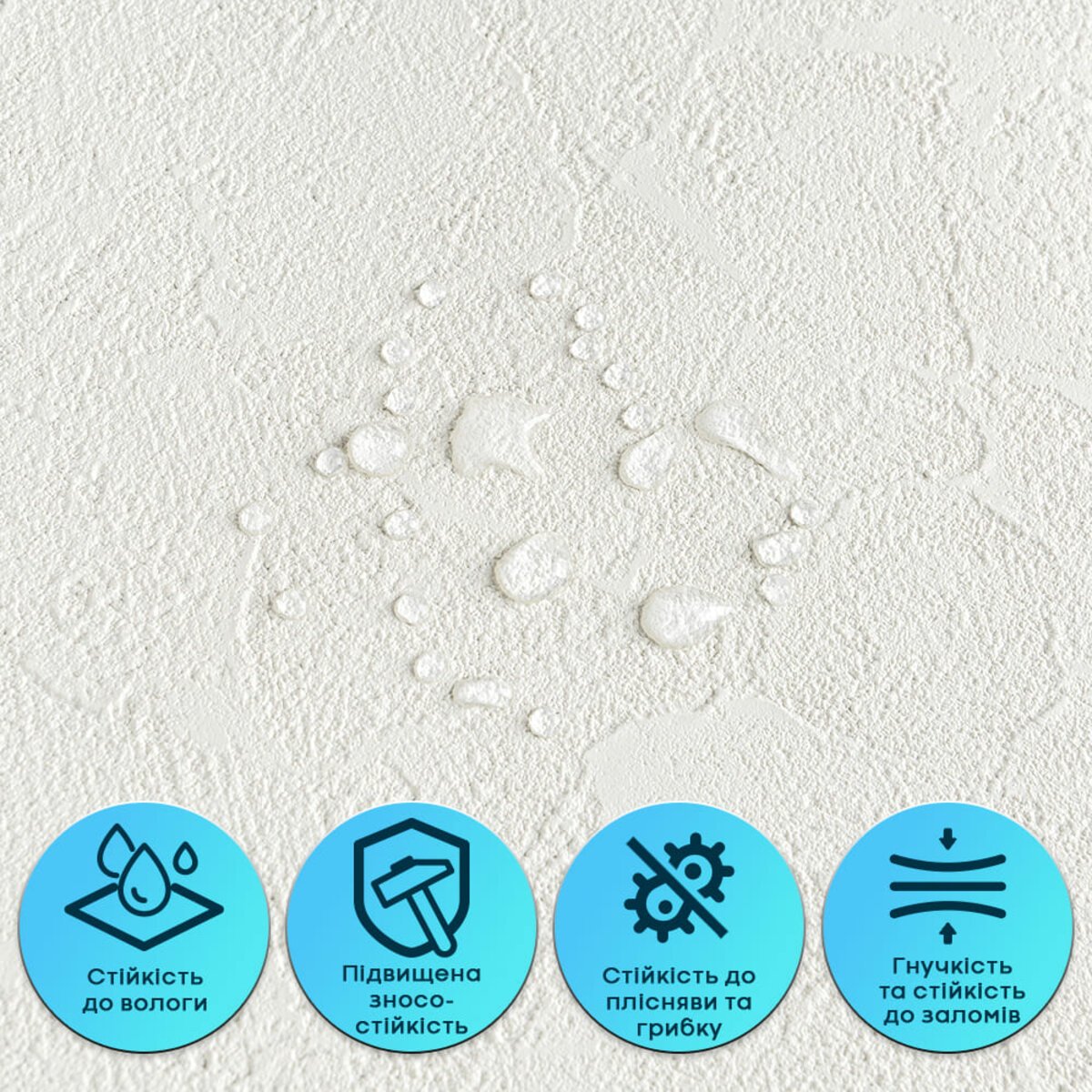 Гнучка штукатурка не вбирає воду, не набухає та не деформується під впливом вологи. Матеріал стійкий до пари, не сприяє утворенню плісняви та підходить для приміщень із підвищеною вологістю — кухонь, ванних кімнат. Може застосовуватися в зоні кухонного фартуха (за умови відступу від плити на 25-30 см).