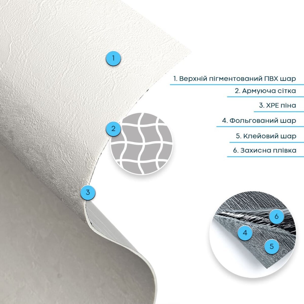 • Армувальна сітка — це внутрішній зміцнювальний шар, який підвищує стабільність і міцність верхнього шару ПВХ. Виготовлена зі синтетичного матеріалу, вона не розтягується, допомагає зберігати форму та фактуру під час монтажу й експлуатації, а також запобігає деформаціям матеріалу.