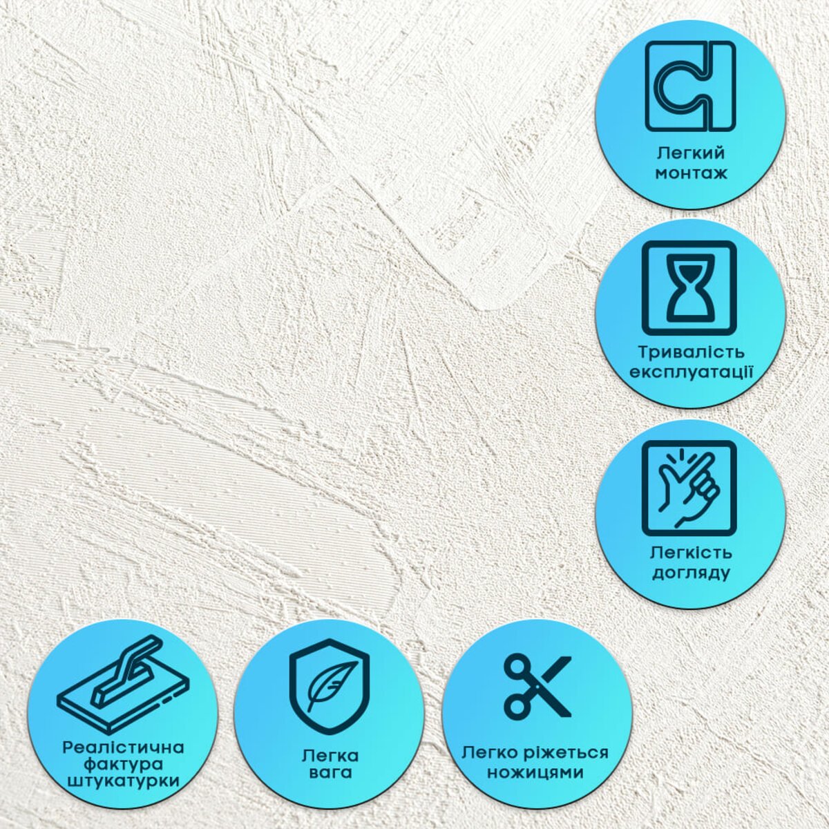 Матеріал є еластичним і легко згинається, що дозволяє монтувати його на нерівні та складні поверхні. Завдяки вбудованій армувальній сітці штукатурка не розтягується, не створює заломів і не деформується під час монтажу або експлуатації. Це гарантує стабільну геометрію та акуратний вигляд після наклеювання.