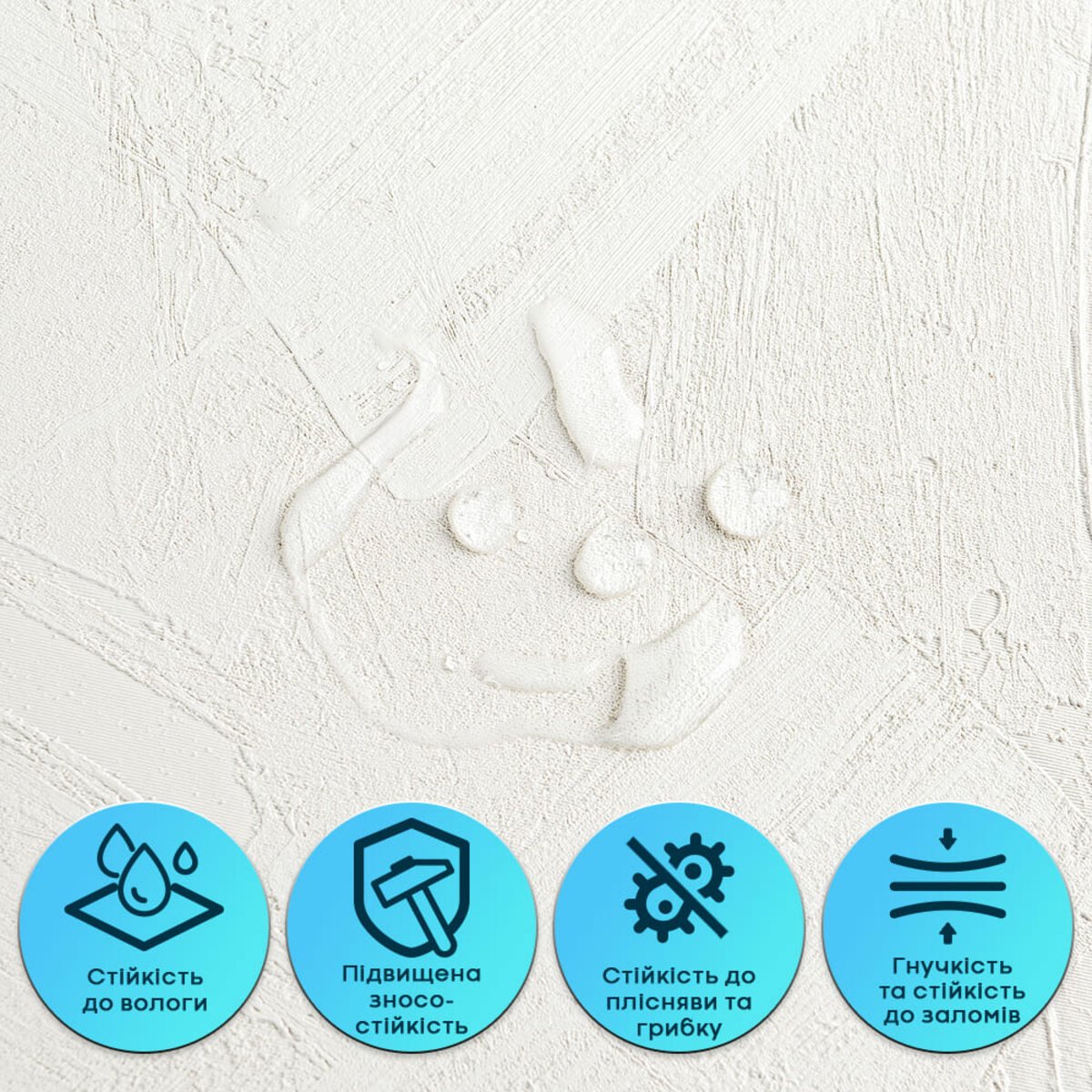 Гнучка штукатурка не вбирає воду, не набухає та не деформується під впливом вологи. Матеріал стійкий до пари, не сприяє утворенню плісняви та підходить для приміщень із підвищеною вологістю — кухонь, ванних кімнат. Може застосовуватися в зоні кухонного фартуха (за умови відступу від плити на 25-30 см).