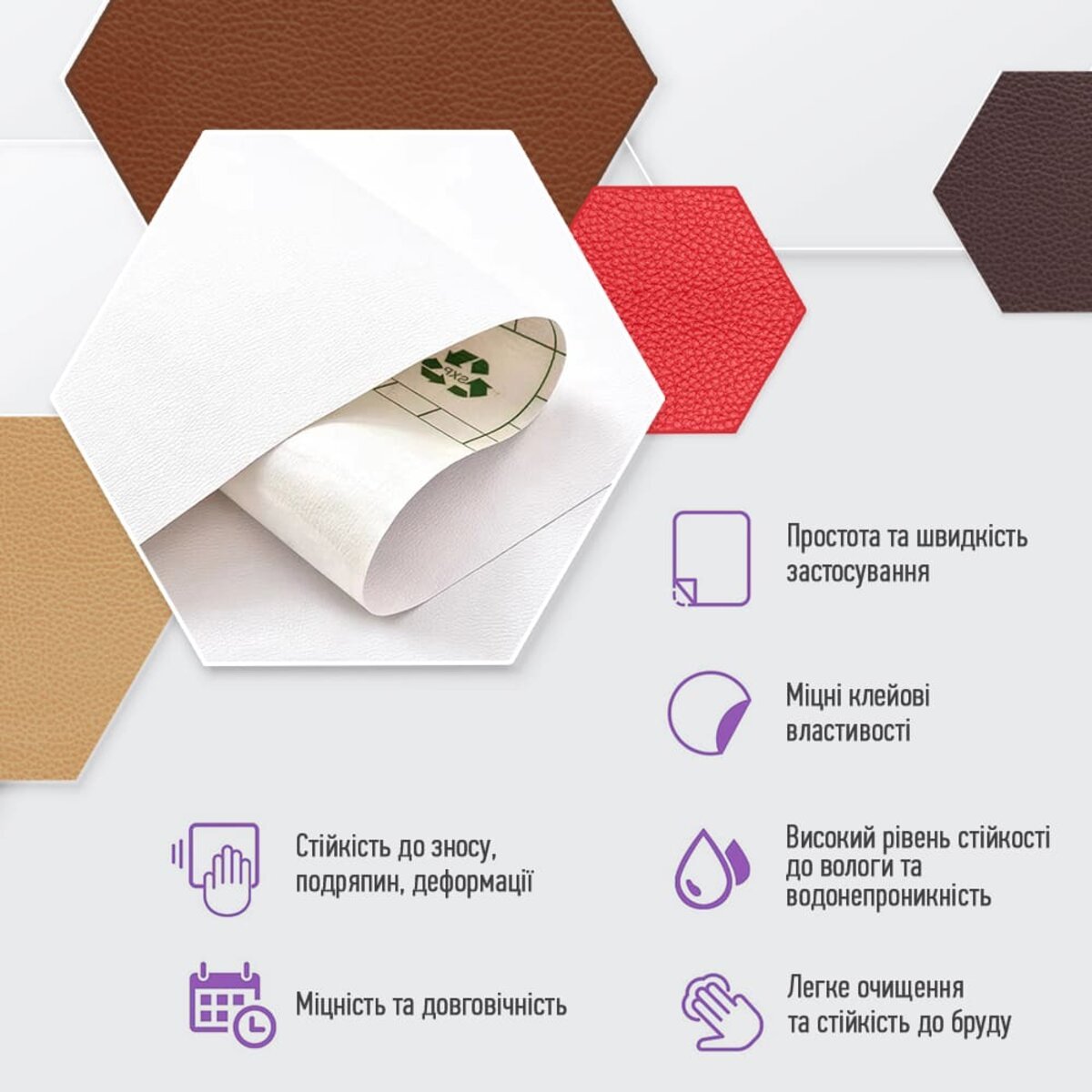 - Екологічна перевага: самоклейна екошкіра виготовляється без використання тваринного шкіряного матеріалу, тому вона є більш екологічною альтернативою натуральній шкірі.