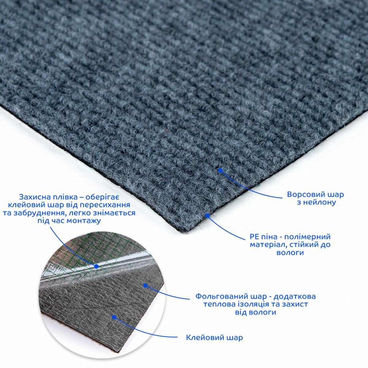 Ворсовий шар з нейлону – складається з волокон, які мають високу міцність на розрив, еластичність, стійкість до вологи і плям.