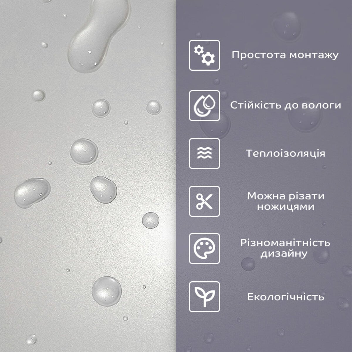 - 2. Стійкість до вологи: матеріал стійкий до впливу вологи та пари, а також до появи плісняви, що робить його придатним для використання у приміщеннях з високою вологістю, таких як ванни та кухні. Плитка підходить для створення фартуха кухні, можна клеїти біля плити на відстані не менше ніж 20-25 см;