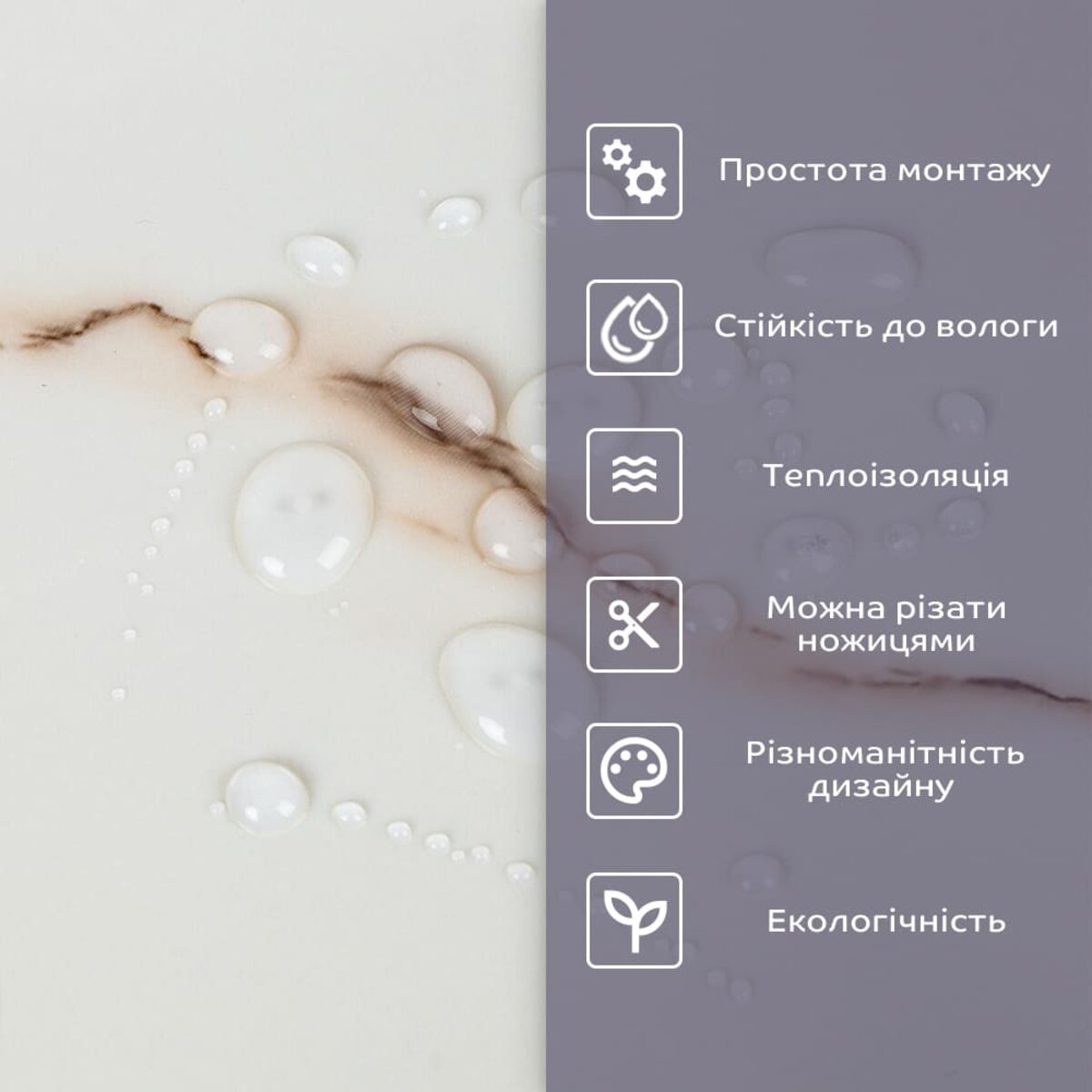 - 1. Легкість та міцність: плитка легка та міцна, що спрощує її логістику, установку та забезпечує довгий термін служби. Матеріал легкий в установці, можна різати ножицями чи монтажним ножем, не потребує додаткових матеріалів чи спеціалістів. Між смугами не розходиться, не роздмухується і не деформується. Відсоток обрізу становить 1%, що є найкращим показником для настінних покриттів;