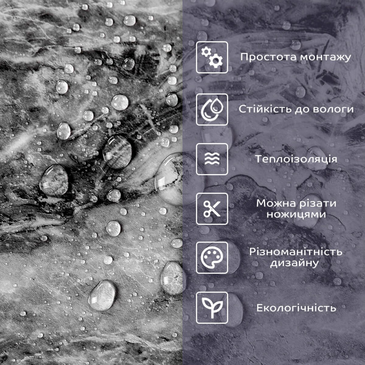 - 1. Легкість та міцність: плитка легка та міцна, що спрощує її логістику, установку та забезпечує довгий термін служби. Матеріал легкий в установці, можна різати ножицями чи монтажним ножем, не потребує додаткових матеріалів чи спеціалістів. Між смугами не розходиться, не роздмухується і не деформується. Відсоток обрізу становить 1%, що є найкращим показником для настінних покриттів;