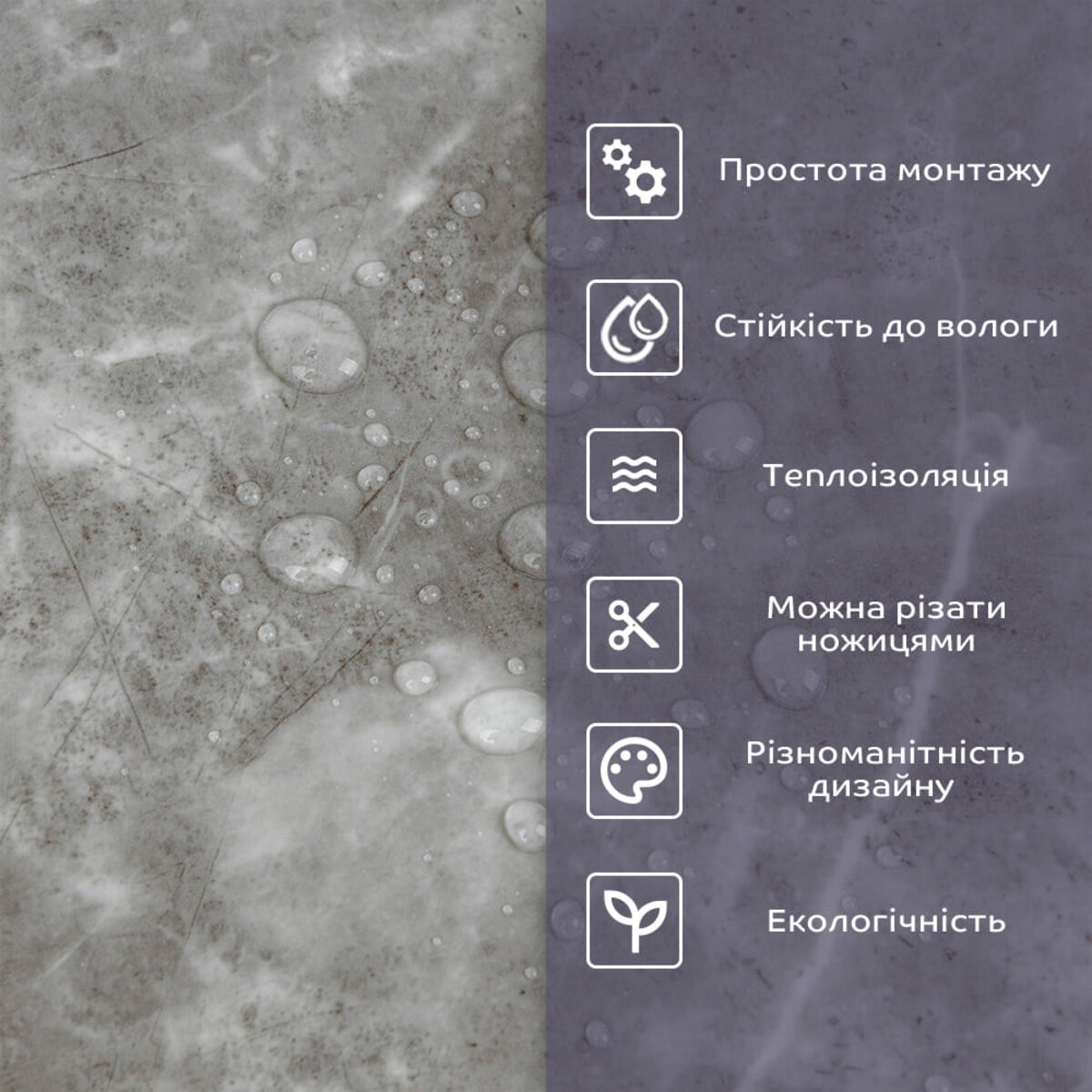 • 2. Стійкість до вологи: матеріал стійкий до впливу вологи та пари, а також до появи плісняви, що робить його придатним для використання у приміщеннях з високою вологістю, таких як ванни та кухні. Плитка підходить для створення фартуха кухні, можна клеїти біля плити на відстані не менше ніж 20-25 см;
