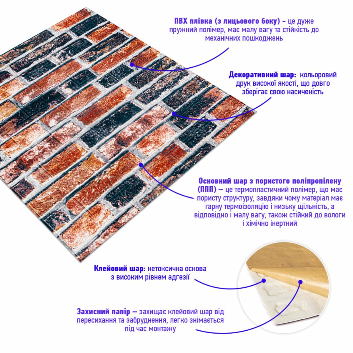 - Захисний папір – оберігає клейовий шар від пересихання та забруднення, легко знімається під час монтажу.