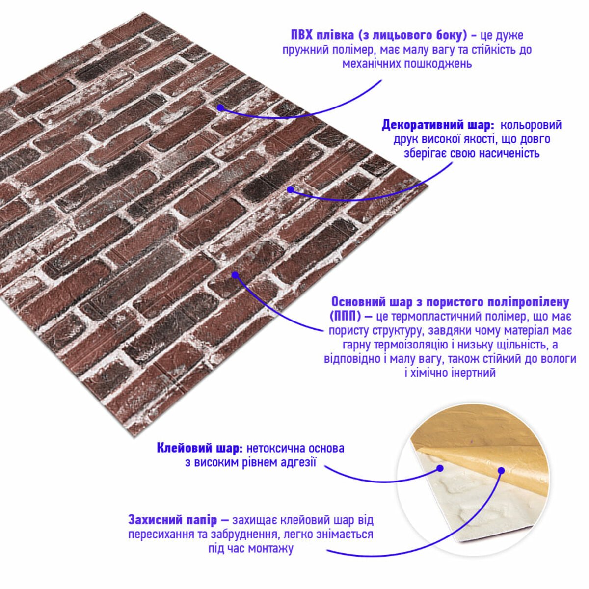 - Захисний папір – оберігає клейовий шар від пересихання та забруднення, легко знімається під час монтажу.
