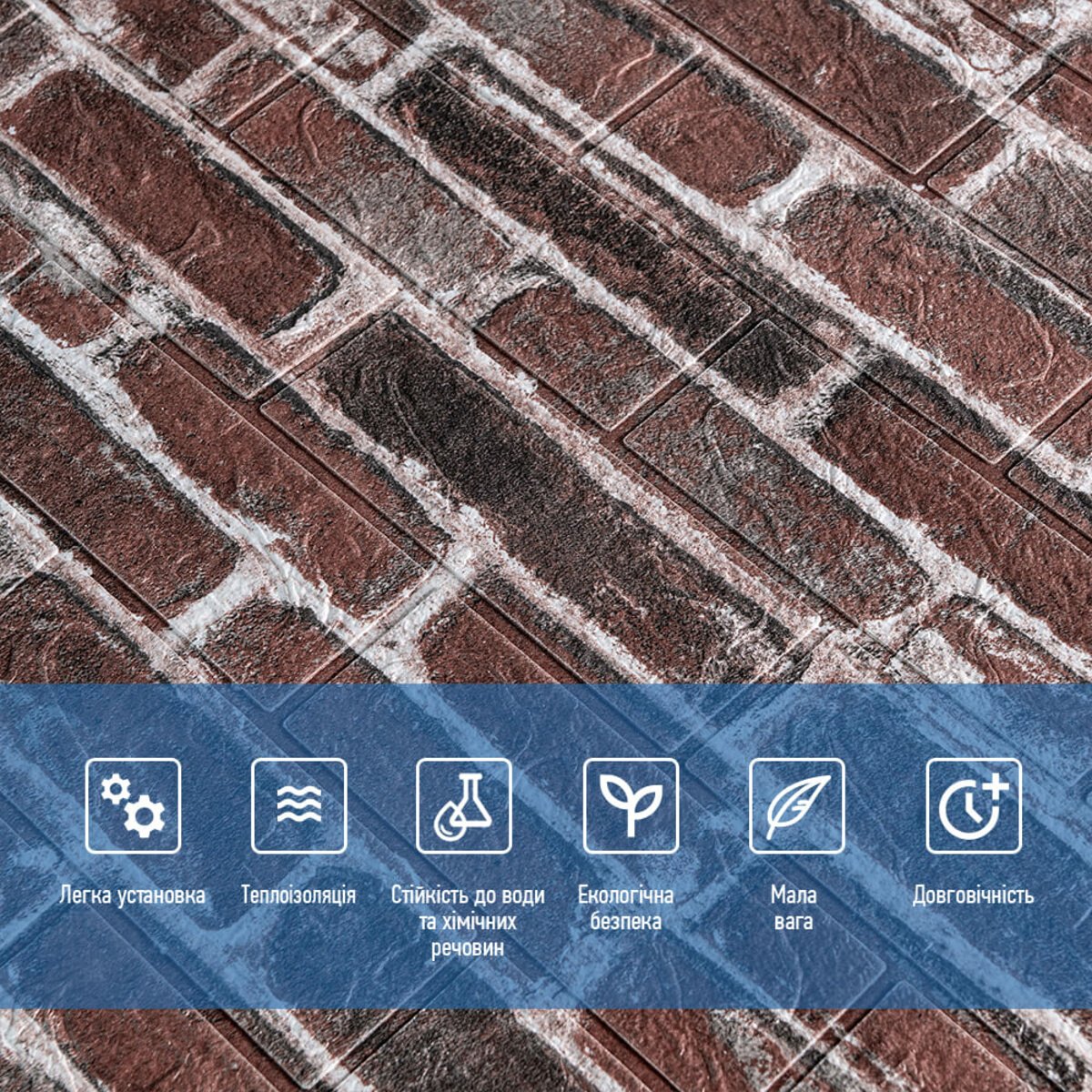 3D панелі самоклеючі – декоративне покриття для стін, виконане з легкого та міцного матеріалу – пористого поліпропілену (ППП). Основна особливість – рельєфний малюнок у вигляді цегли у широкому різноманітті кольорів та наявність клейового шару, що дозволяє встановити панелі без необхідності застосування додаткових матеріалів.