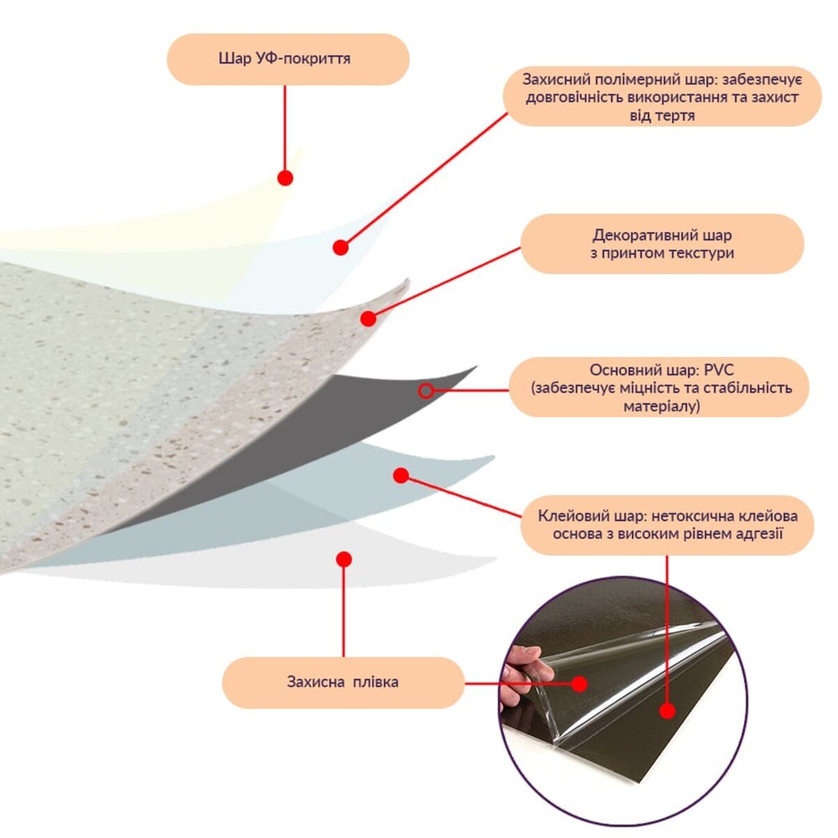 • Декоративний шар: плівка із кольоровим друком, який повністю передає фактуру природних матеріалів: деревини, каменю та інших
