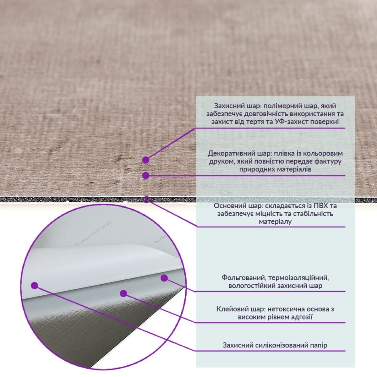 2. Декоративний шар: плівка з кольоровим друком високої якості, яка повністю імітує фактуру природних матеріалів завдяки чіткому та деталізованому зображенню.