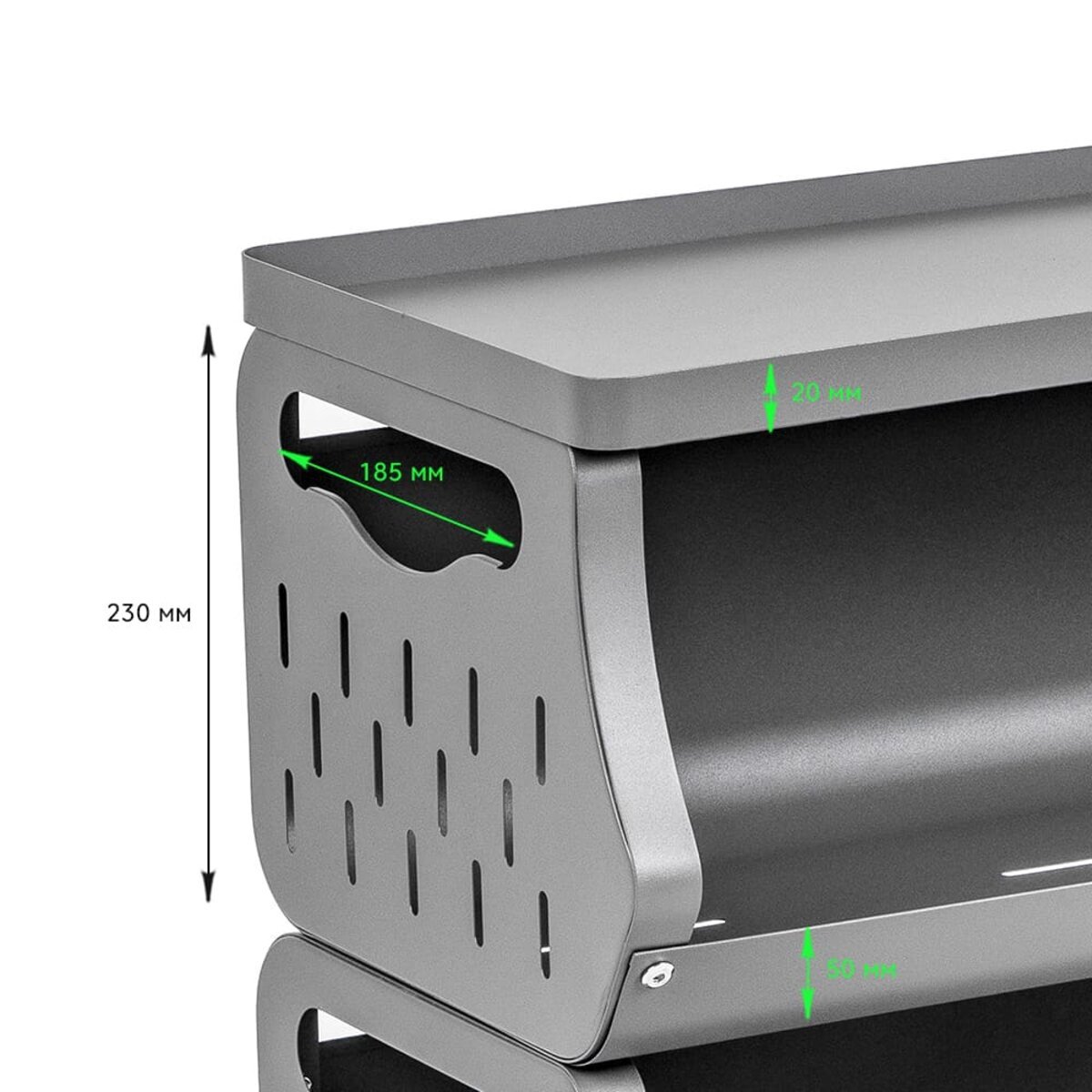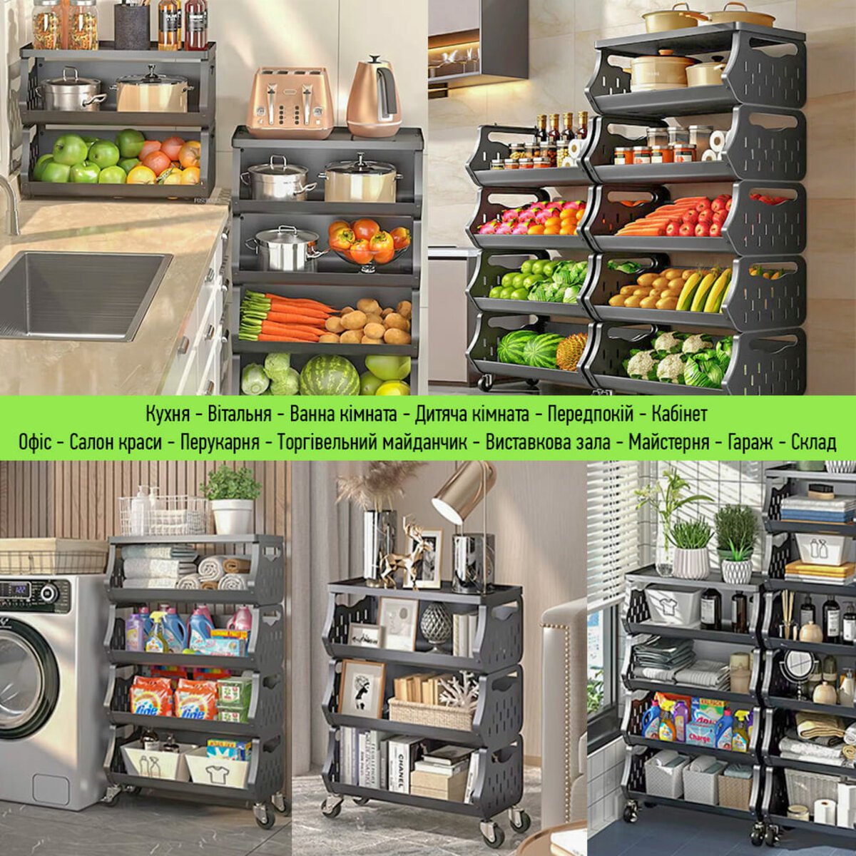 Стелаж ідеально підходить для організації простору на кухні, де можна зберігати продукти, посуд чи кухонне приладдя. У ванній кімнаті він стане незамінним для зберігання рушників, косметики та засобів гігієни. В офісах його можна використовувати для впорядкування паперів, канцелярії чи архівних документів. У вітальні стелаж стане місцем для книг, декоративних елементів або невеликої техніки. У гаражі чи майстерні він відмінно підходить для інструментів, запчастин і витратних матеріалів. Завдяки перфорованим стінкам, стелаж також зручний для зберігання овочів, фруктів чи текстилю, забезпечуючи хорошу вентиляцію.