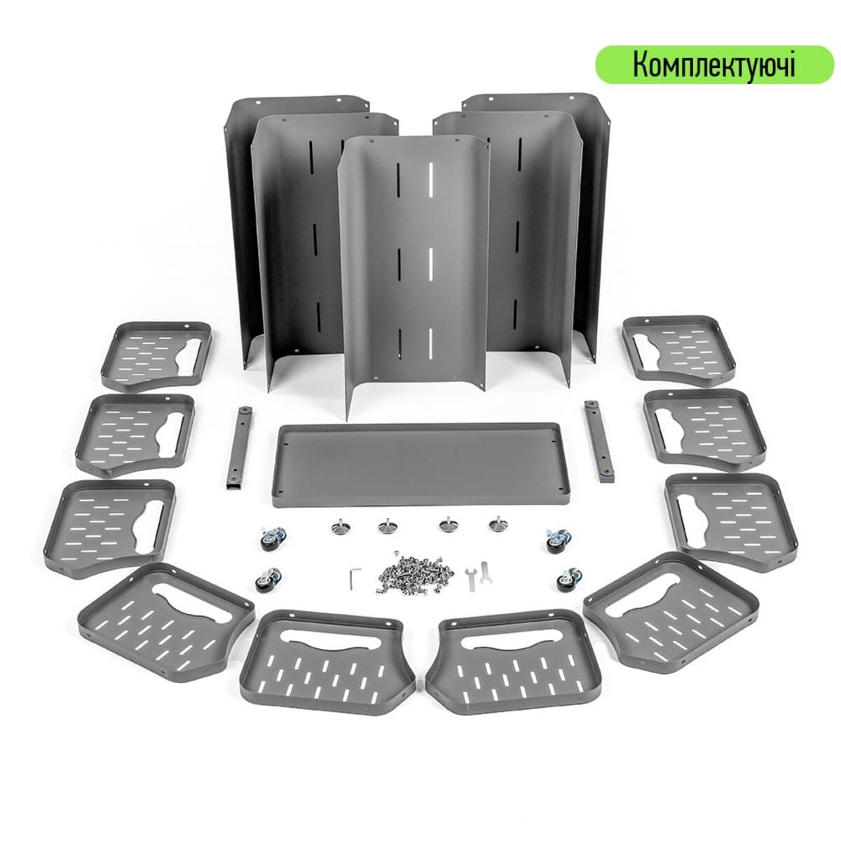 Основна конструкція виконана зі сталі, що надає виробу стійкості до механічних навантажень та забезпечує тривалий термін експлуатації. Металеві поверхні покриті порошковою фарбою, яка створює надійний захисний шар, що запобігає корозії, подряпинам та іншим пошкодженням.
