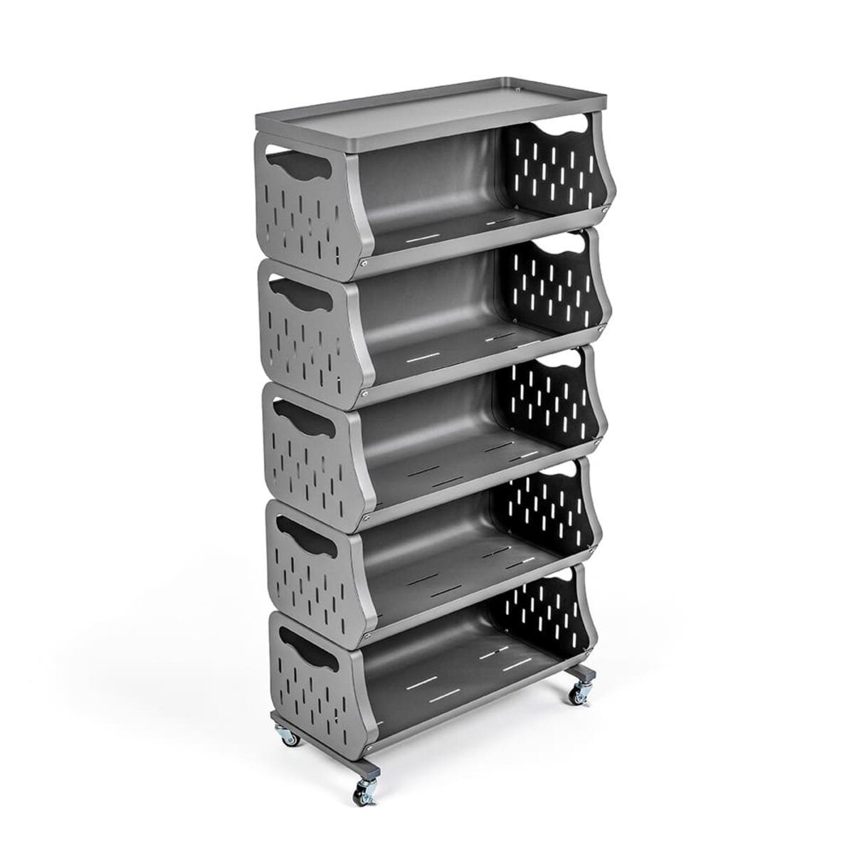 Бокові панелі мають перфорацію, що сприяє вентиляції, наприклад, продуктів харчування чи текстилю. Колеса виготовлені з міцного полімеру, що забезпечує легкість переміщення стелажа без подряпин на підлозі.