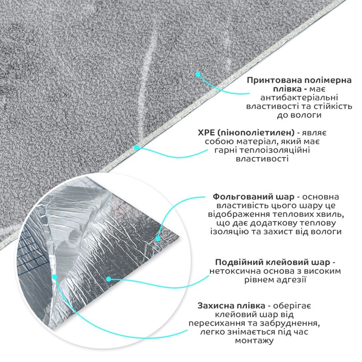 - Захисна плівка: оберігає клейовий шар від пересихання та забруднення, легко знімається під час монтажу.