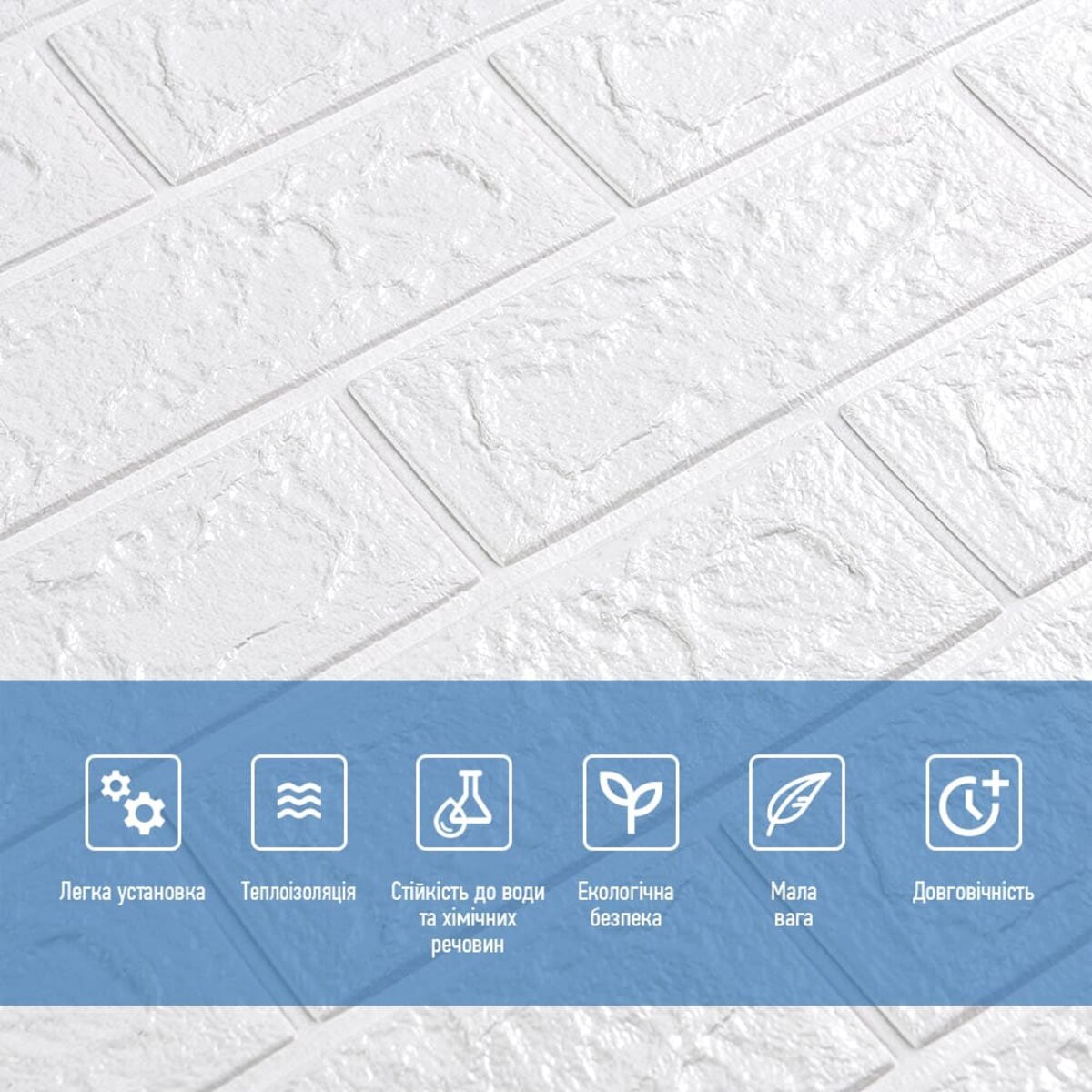 3D панелі самоклеючі – декоративне покриття для стін, виконане з легкого та міцного матеріалу – пористого поліпропілену (ППП). Основна особливість – рельєфний малюнок у вигляді цегли у широкому різноманітті кольорів та наявність клейового шару, що дозволяє встановити панелі без необхідності застосування додаткових матеріалів.