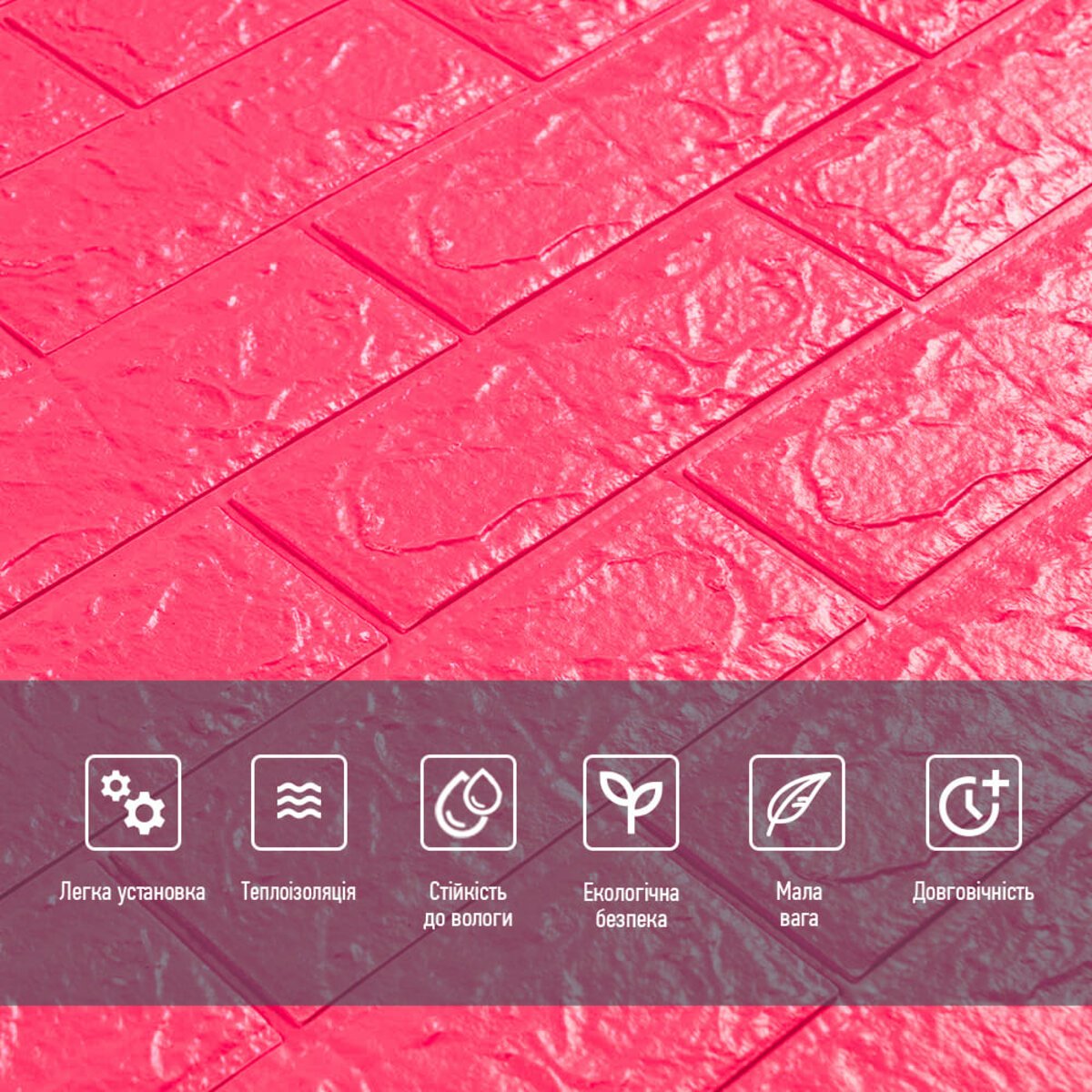 3D панелі самоклеючі – декоративне покриття для стін, виконане з легкого та міцного матеріалу – пористого поліпропілену (ППП). Основна особливість – рельєфний малюнок у вигляді цегли у широкому різноманітті кольорів та наявність клейового шару, що дозволяє встановити панелі без необхідності застосування додаткових матеріалів.