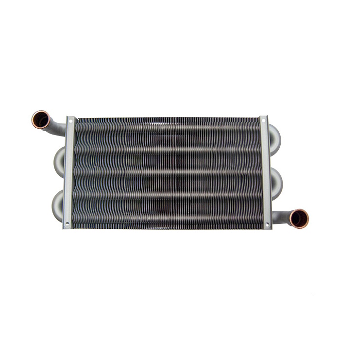 Первинний теплообмінник для настінних газових котлів, виконаний із мідних труб та напаяних мідних пластин. Має високу жаростійкість і антикорозійні властивості. Дозволяє використовувати як теплоносій як антифризи, так і звичайну воду.
